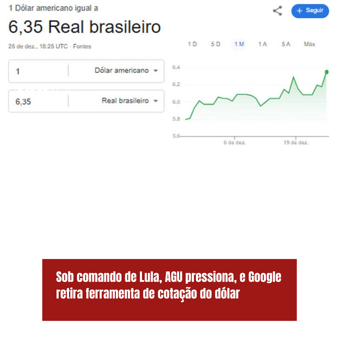 A Advocacia-Geral da União (AGU), sob orientação do governo federal liderado pelo presidente Luiz Inácio Lula da Silva (PT), solicitou que o Banco Central investigasse discrepâncias na cotação do dólar exibida pelo Google. Após a pressão, a empresa retirou do ar sua ferramenta de cotação, que no dia 25 de dezembro mostrava o dólar a R$ 6,38, enquanto o valor oficial era R$ 6,18.